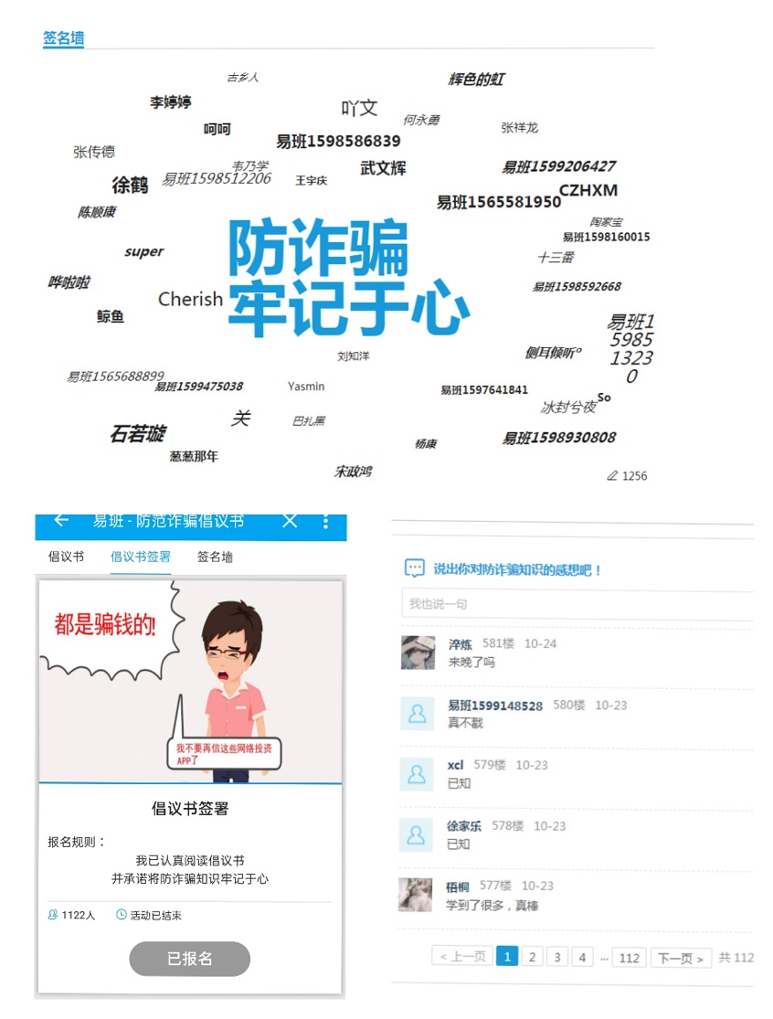 10月20—23日,学院在易班平台搭建了“防范电信诈骗倡议书”轻应用,充分利用知识学习模块将网上购物诈骗、票务售卖暗藏骗机、冒充熟人来骗钱、兼职刷单有风险、游戏中的诈骗术、利滚利之校园贷等多种骗局进行线上案例展示。1122名学生主动学习各类防范诈骗知识并签署倡议书,在学习防范诈骗知识的过程中,有581名学生围绕着电信诈骗种类、潜在风险以及亲身经历等方面参与讨论,倡议活动和签名受到校相关部门以及其他学院师生广泛关注。