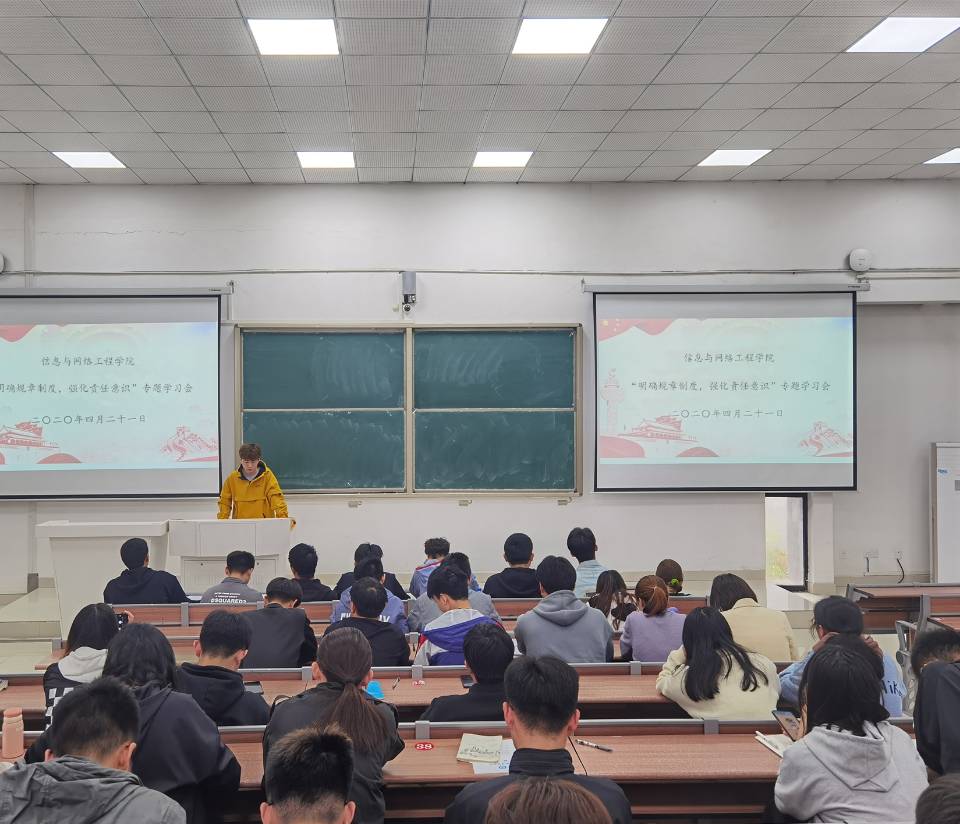 为进一步贯彻落实习近平总书记在党史学习教育大会的重要讲话精神,抓好我院团学组织深化改革,强化团学组织的服务意识、纪律意识。4月21日下午,信息与网络工程学院于致知楼B111召开“明确规章制度,强化责任意识”专题学习会。学生会全体成员参加会议,会议由学习发展部主任张廷雨主持。