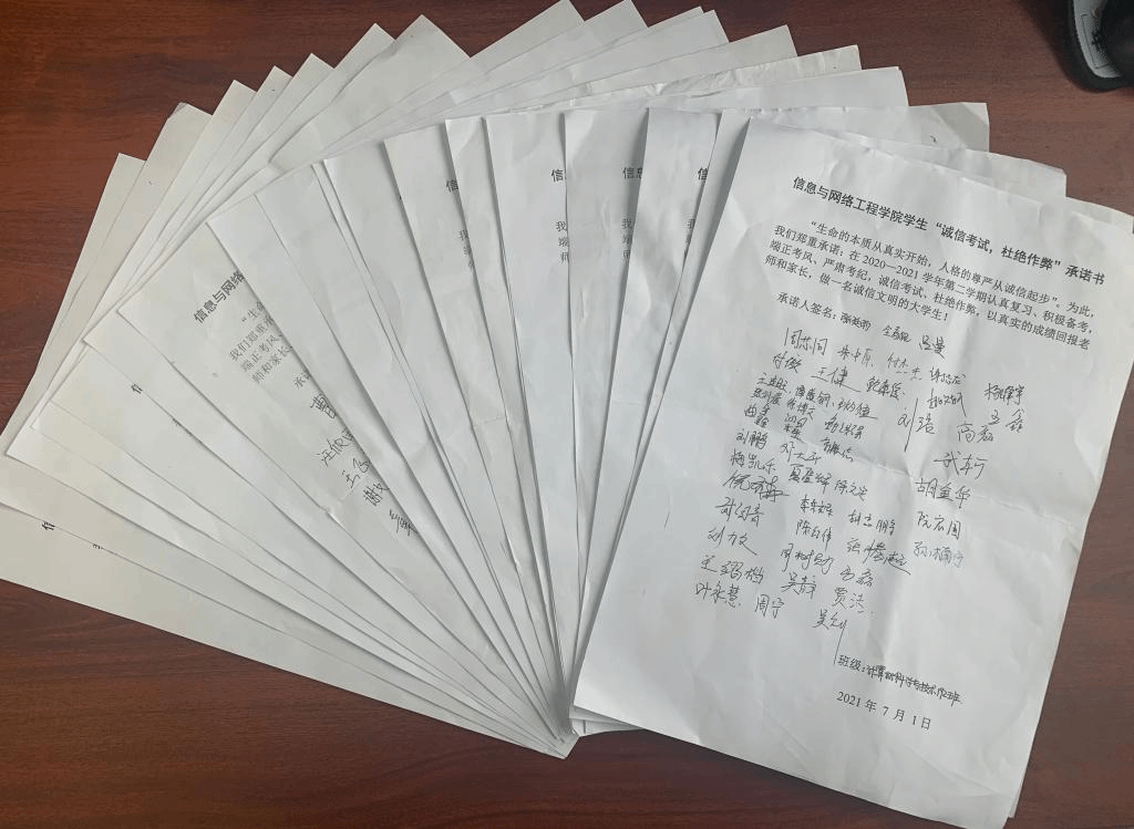 为确保将主题班会落到实处,学院专门制定《信息与网络工程学院考风考纪教育主题班会提纲》,准备了相关会议资料,要求各班辅导员按照提纲的内容和要求认真落实,精心准备。主题班会上,全体同学共同学习了《学生手册》中《安徽科技学院考试工作实施细则(节选)》及《安徽科技学院学生违纪处理方法》,开展了警示教育,按照《信息与网络工程学院诚信考试倡议书》的内容,发出了诚信考试倡议,希望同学们树立底线思维,积极响应学校的号召,手握诚信纸笔,书写高尚考风,坚决抵制各种舞弊行为,净化考场环境,展现自我真实水平,端正的考风、积极创造优良的学风。各班辅导员在总结时强调,诚信文明是立德成才的根本,是大学生必备的核心品质与基本修养,对大学生的未来职业发展、个人成才有着至关重要的作用。主题班会结束后,各辅导员组织全体学生签署了《信息与网络工程学院学生“诚信考试,杜绝作弊”承诺书》。