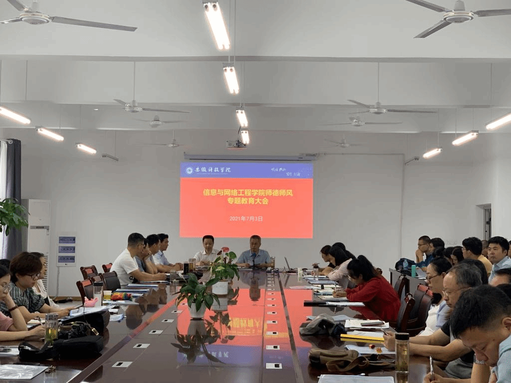 为全面贯彻习近平总书记中国足彩网教育的重要论述和全国全省教育大会精神,进一步加强学院师德师风建设,7月3日上午,信息与网络工程学院在尚行楼B418会议室召开师德师风专题教育大会。学院党委书记王振其、院长余宏杰、正处级组织员周向群、党委副书记韦乃学、副院长何恩节、副院长曹浩及全体教职工参加会议,会议由王振其主持。