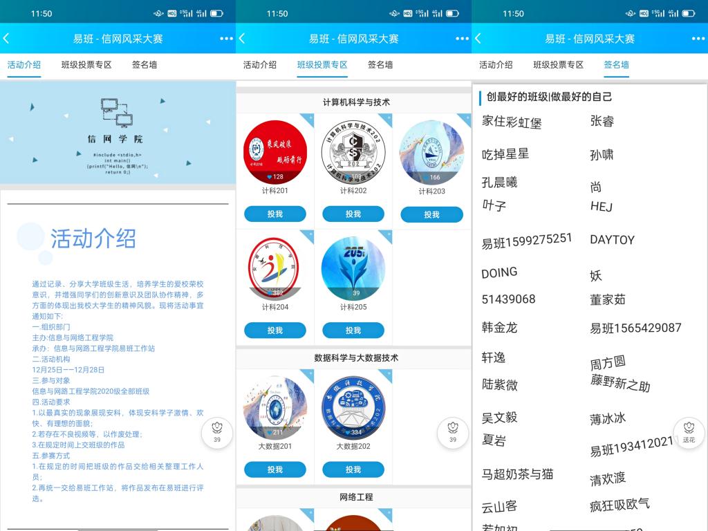 为深入贯彻“网络育人”理念,增强班级凝聚力、向心力,信息与网络工程学院结合专业学科特点,将传统活动与新媒体平台相融合,在11月10日至12月12日期间,组织开展第二届网上班级风采大赛,活动以2020级各班为参赛主体,面向全院学生。