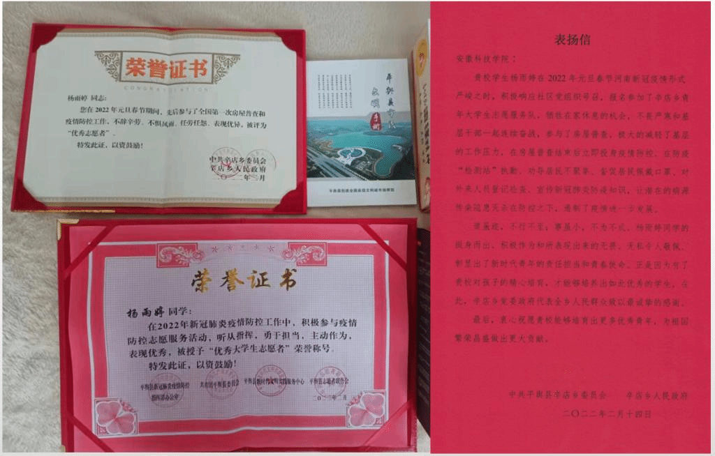 信中说,2022年元旦春节期间,河南新型冠状病毒肺炎疫情形势严峻之时,我校杨雨婷同学主动参加青年大学生志愿服务队,不畏严寒,连续奋战在一线,参与家乡房屋普查,投身疫情防控,为联防联控疫情蔓延做出了贡献。赞扬杨雨婷同学挺身而出、积极作为、彰显了新时代青年的责任担当和青春使命,代表家乡人民感谢学校对孩子的精心培育。