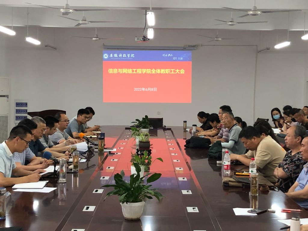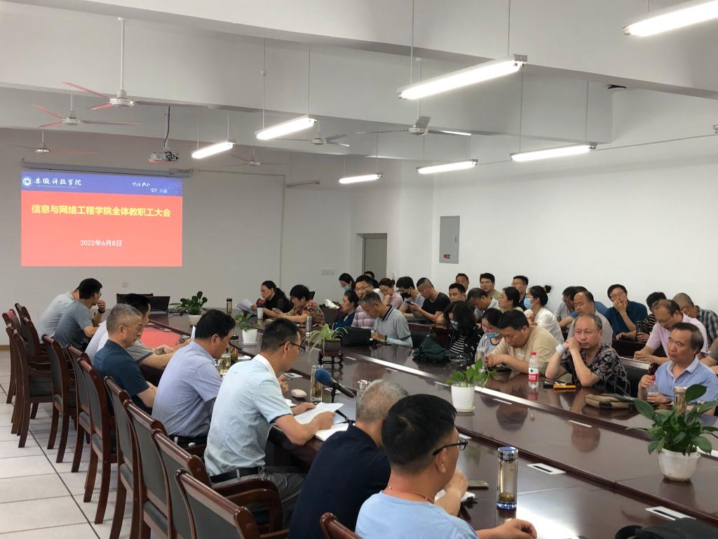6月8日下午,信息与网络工程学院在尚行楼B418会议室召开教职工大会部署期末和暑期重点工作。学院党委书记王振其,正处级组织员周向群,党委副书记韦乃学,副院长何恩节,副院长曹浩及全体教职工参加会议,会议由院长余宏杰主持。