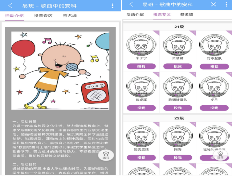 本次比赛以“闪耀青春,歌唱未来”为主题,采用线上线下相结合的方式,参赛选手通过全民K歌平台录制歌曲,提交生成音频链接形式的作品。学院组织各班级辅导员、学生会成员成立评委组,从34份初赛作品评选出20份优秀作品进入决赛。为扩大活动影响力,本次比赛同时在易班平台上开展线上投票,经过激烈的评比,最终选出了6组获奖作品。计算机科学与技术224班汪彤、汪笑珺、李小红、余瑞、张晓茹合唱的《岁月神偷》荣获一等奖;网络工程(中韩合作)222班龚文晨演唱的《年少有为》、计算机科学与技术224班谢雨芹演唱的《try (Colbie Caillat)》荣获二等奖;计算机科学与技术222班谷桐闽演唱的《淋雨一直走》、计算机科学与技术221班陶海演唱的《断点》以及计算机科学与技术221班吕堂震、陶健胜、潘宇合唱的《阳光开朗大男孩》荣获三等奖。