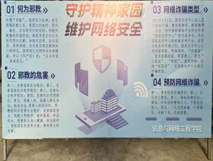 为提高学生网络安全意识,营造健康文明的网络环境,4月19日下午,信息与网络工程学院在知味园广场举办第五届网络安全教育宣传展,学院全体学生积极参加活动。