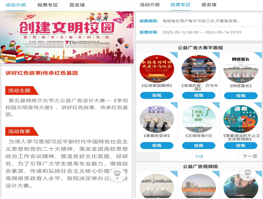 本次比赛分为平面广告和视频广告两个赛道,作品主题主要围绕党的二十大、社会主义核心价值观、“四史”学习教育、弘扬爱国主义精神、建设清朗网络空间等内容。本次收到的大赛作品包含绘画、微电影、PPT、海报等多种方式形式,展示参赛学子们的勤俭节约、明理诚信等中华民族的传统美德,为师生们呈现了一幅幅构思巧妙、立意新颖的作品。经过评选,《请党放心,强国有我》、《文明伴我行》、《不负美好“食”光》、《网络警长》、《校园环保》等作品获奖。