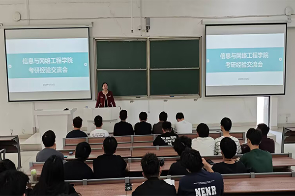 4月23日下午,信息与网络工程学院在致知楼B111举办考研经验交流会。学院党委副书记韦乃学、专职辅导员许磊、2025届优秀考研学子代表林璋圣、刘坤、盛猛、郭祖硕、陶一繁、张佳威出席本次交流会,学院2026届各班考研同学参加本次会议,会议由许磊主持。