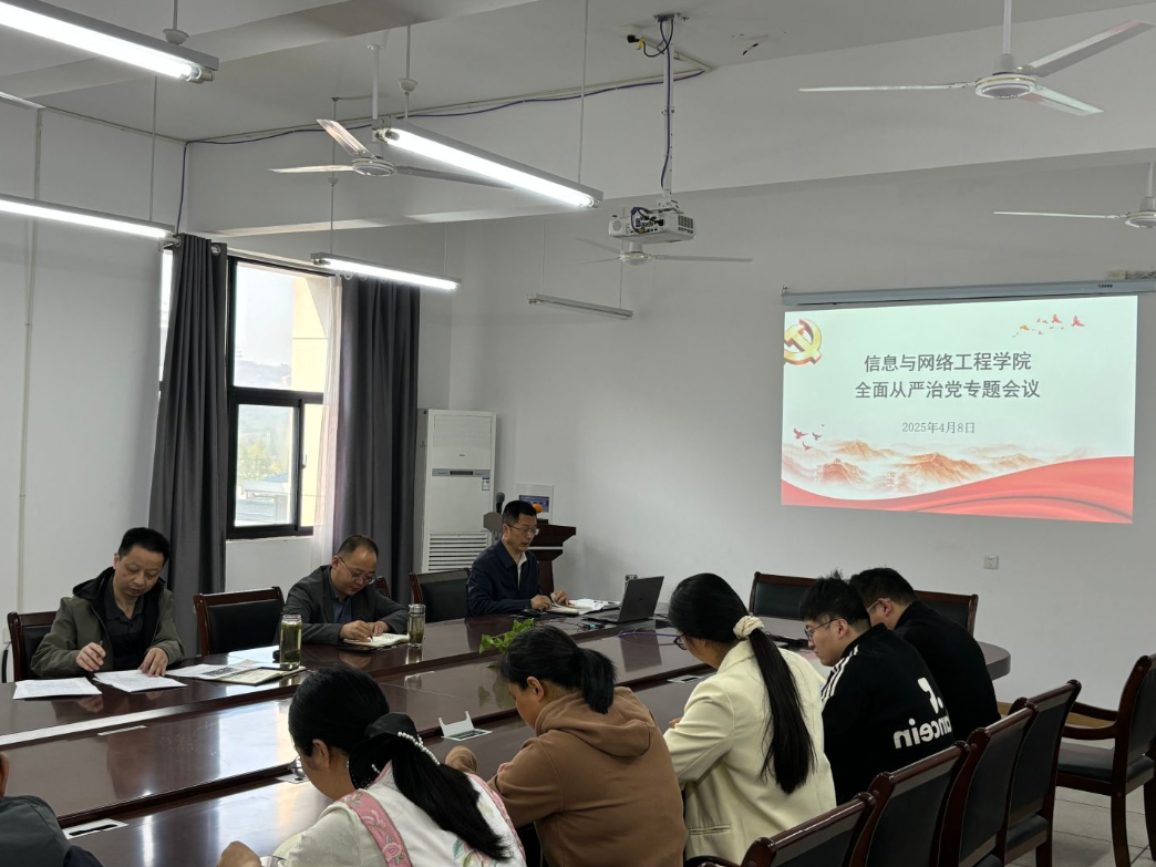 为深入贯彻落实新时代党的建设总要求,进一步推动全面从严治党向基层延伸,4月8日上午,信息与网络工程学院在龙湖校区尚行楼B418会议室召开全面从严治党专题会议。学院党委委员、纪委委员、各党支部书记、各系部主任、实验室主任及科级以上干部参加会议。会议由学院党委书记王振其主持。