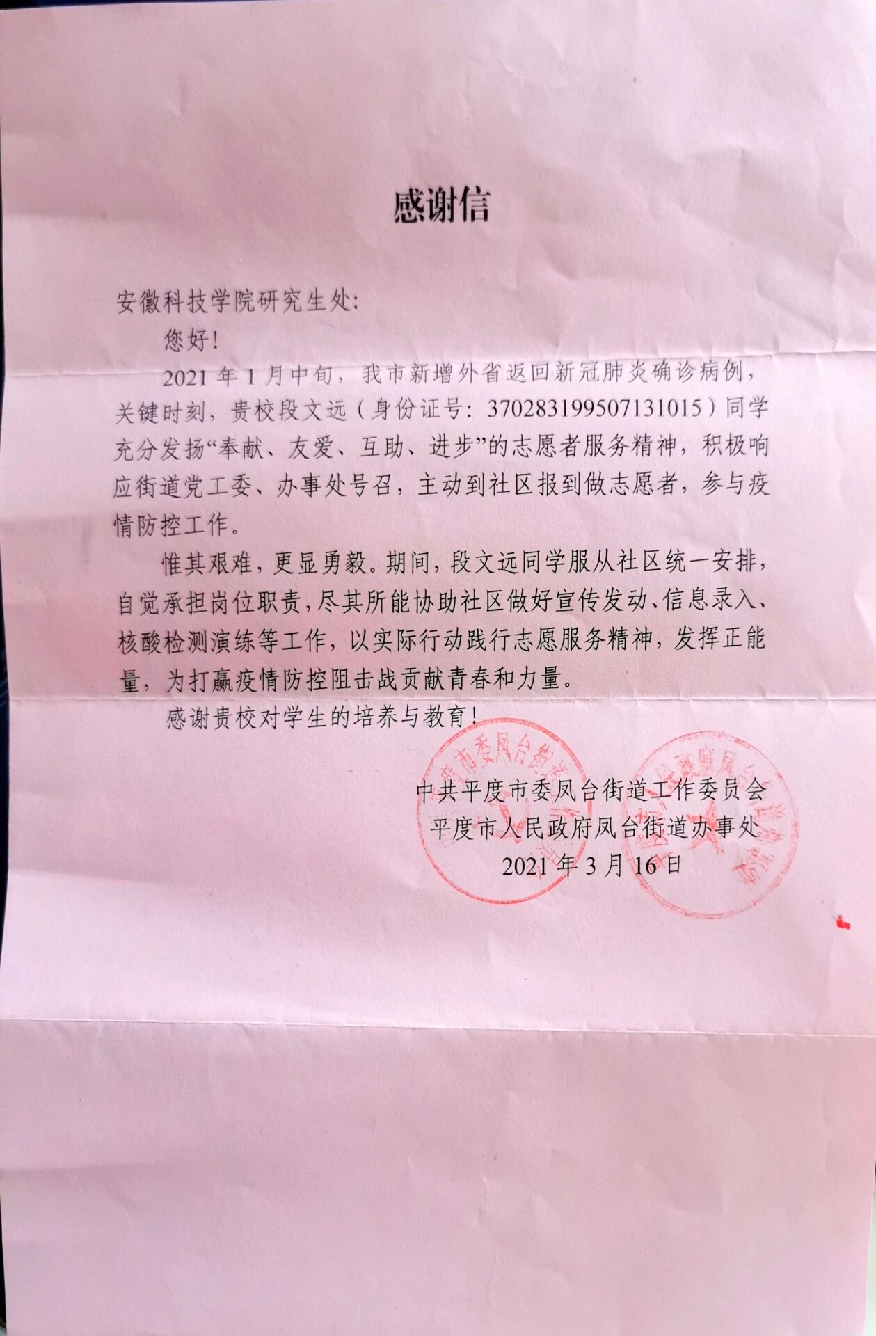2021年7月底,一封由山东省青岛市平度市人民政府凤台街道办事处寄出的表扬信送达我校研究生处,信中对我校2020级农业工程与信息技术专业研究生段文远同学不顾个人安危,在寒假期间主动参与本市突发疫情的防控志愿工作进行了感谢与赞扬。