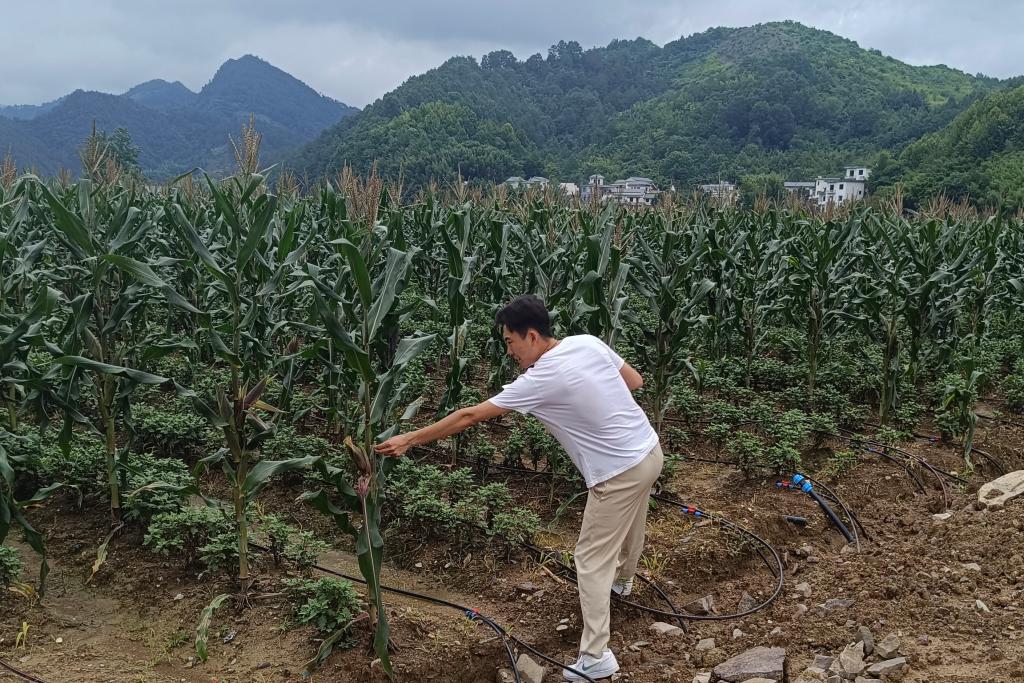 在溪头镇桃源村的菊花地上,菊花长势良好,安徽科技学院歙县贡菊科技小院驻站研究生公维勇、方俊超和村民正顶着烈日抢收玉米。采收的过程中,大家脸上洋溢着丰收的喜悦,一筐筐玉米被采摘下来称重、分销。