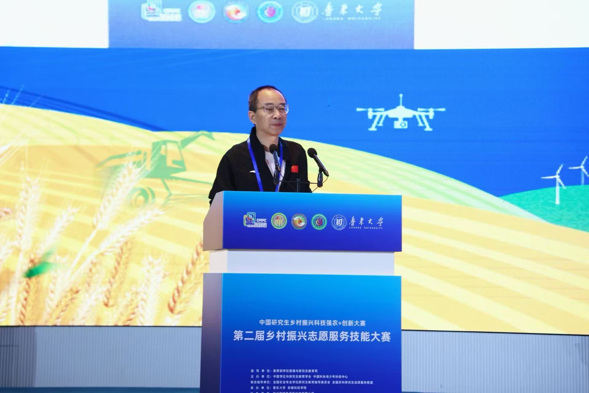 郭鑫在致辞中指出2020年全国农业教指委指导成立全国农科研究生志愿服务联盟。同年,中国研究生乡村振兴科技强农+创新大赛纳入中国研究生创新实践系列大赛,乡村振兴志愿服务技能大赛作为重要赛道,为农科研究生服务乡村振兴、提升实践创新能力搭建了优质交流平台。他特别感谢鲁东大学和安徽科技学院为赛事成功举办所做的筹备工作。同时,他寄语参赛研究生,要践行习近平总书记给 “科技小院” 的回信精神,志存高远、脚踏实地,将课堂学习与乡村实践紧密结合,厚植爱农情怀、练就兴农本领,在乡村振兴大舞台建功立业,为农业农村现代化、社会主义现代化国家建设贡献青春力量。