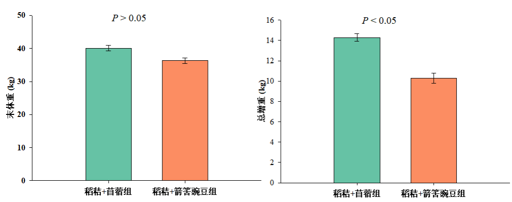 图3 饲喂水稻秸秆对绵羊末体重、总增重的影响