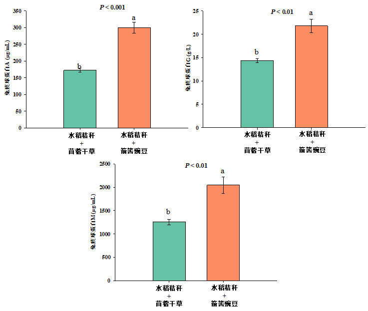 饲喂水稻秸秆与箭筈豌豆干草较饲喂水稻秸秆与苜蓿干草的羔羊血液免疫球蛋白A、G、M显著提高了74.0%、51.6%、63.0%(P < 0.01;图4),极大增强了羊群的体质,有效降低了疫病的发生,为羊群建立免疫屏障,给养羊户减少治疗疫病药物投入。