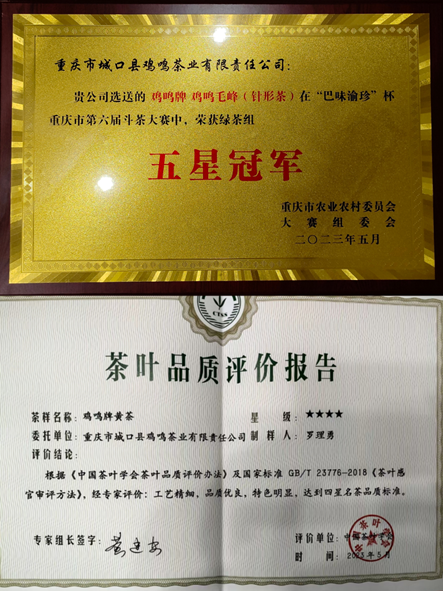 6.指导生产的鸡鸣牌鸡鸣火红在“巴味渝珍”杯重庆市第六届斗茶大赛全民斗茶赛中荣获“重庆好茶”称号;