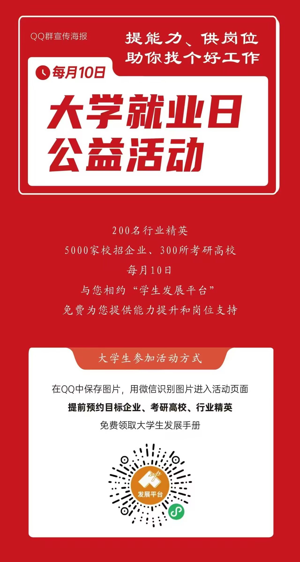 同学们,本次活动将有2000名行业精英,分享前沿经验。5000家校招企业携带海量优质岗位,涵盖互联网、金融、制造业、服务业等多个热门行业,为同学们提供了广阔的选择空间。300所考研高校,助力升学梦想。解读招生政策、专业优势和培养特色,科学规划备考、复习技巧,全方位助跑同学们的考研上岸之梦。