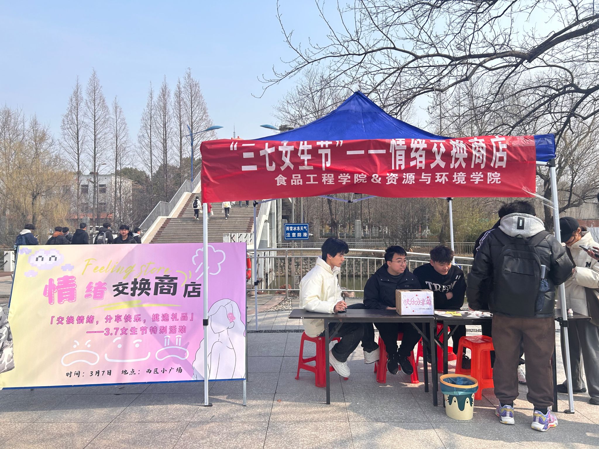 为关爱女同学们的心理健康,倾听女生心声,展现女生的青春活力,3月7日,资源与环境学院与食品工程学院共同在西区小广场举办“三七女生节——情绪交换商店”主题活动。
