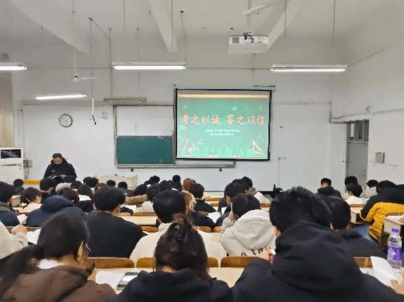 随后,吴国良对考试违纪、作弊的界定标准和处理流程进行详细解读,让同学们深刻认识到考试作弊的危害。他要求各班级于本周内召开诚信考试主题班会,将会议精神传达到每一位学生。此外,吴国良还强调,应继续重视晚自习学习质量,传承学院优良学风;最后,他鼓励同学们合理分配时间,组建学习互助小组,营造互帮互学、共同进步的良好氛围,以饱满的精神状态和扎实的知识储备迎接考试。