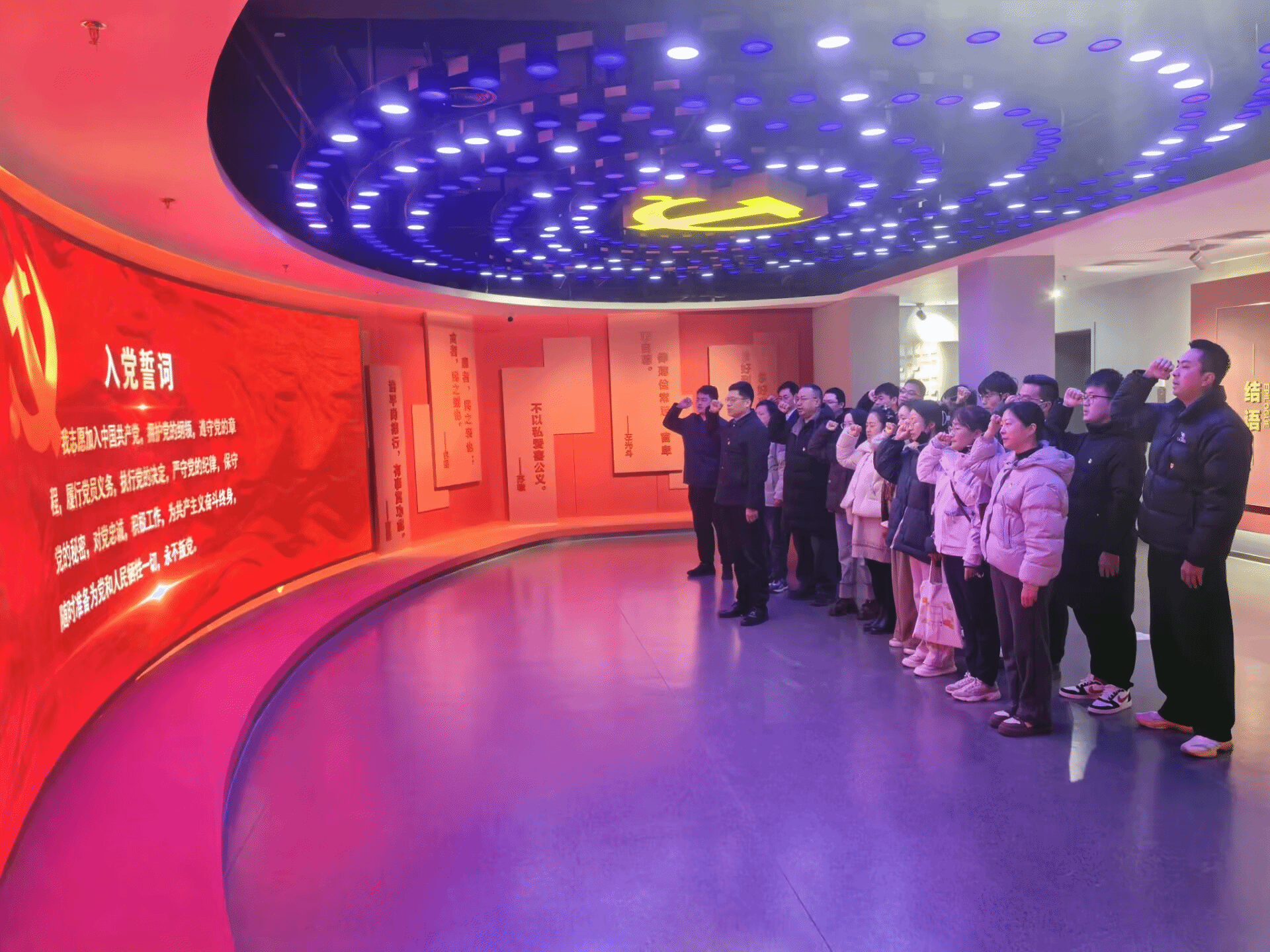活动过程中,学院党委书记沈树周带领全体党员,面对鲜红党旗,庄严举起右拳,重温入党誓词。铮铮誓言在展厅内回响,表达了全体党员坚守初心使命、永葆清廉本色的坚定决心。