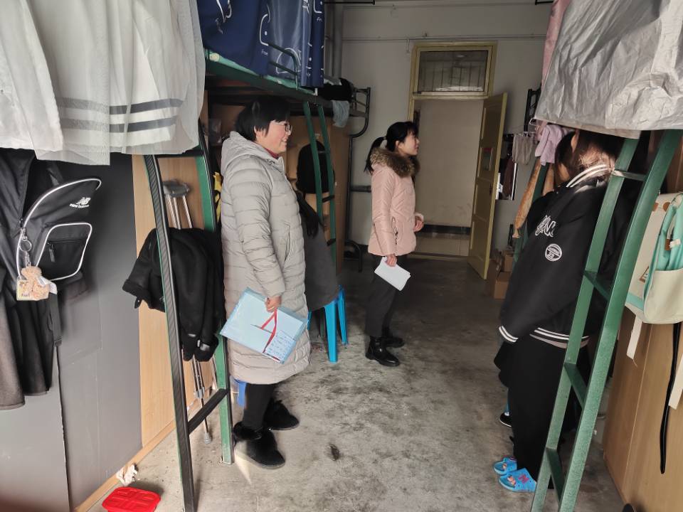 谢宜勤和王丽萍前往女生宿舍查看。她们检查了学生宿舍的卫生情况,向学生了解宿舍生活情况,询问同学们日常生活中遇到的问题,并给予建议,并叮嘱学生们要时刻保持寝室卫生整洁。她们还询问了学生近期的学习情况,提醒大家期末考试临近,养成良好的作息习惯,加强复习,争取取得优异成绩。