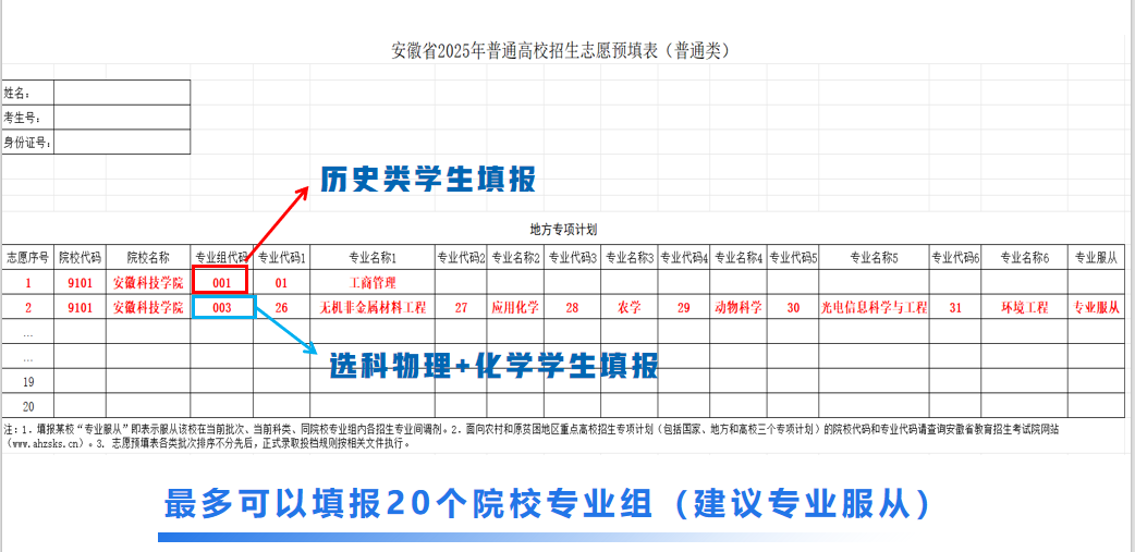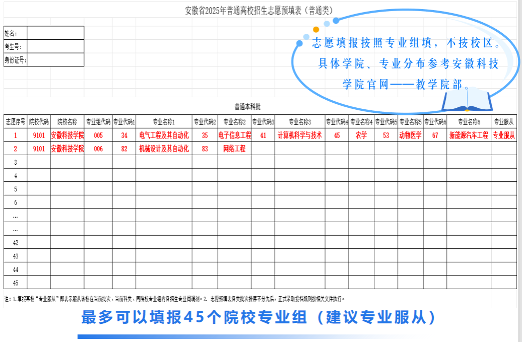 我校2025年在安徽省招生代码为9101,两个录取批次,分别是普通本科提前批(包含地方专项)、普通本科批。为方便广大考生填报志愿,以安徽省各批次志愿预填表为例,图解志愿填报。安徽省外考生请关注各省份教育考试官方机构提供的志愿报考参考指南,安徽科技学院省外招生代码见本省报考指导书。