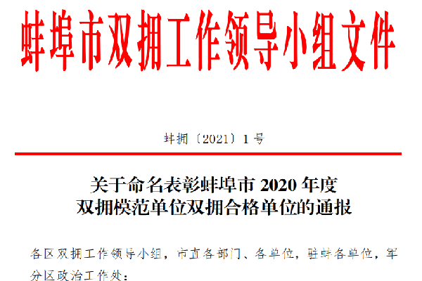 学校荣获“蚌埠市2020年度双拥模范单位”称号,这是全校师生共同努力的成果。我校师生正以教育拥军为载体,为拥军优属做实事、办好事,长期保持拥军优属的良好风尚,为国家军队国防建设贡献自己的力量。(特约通讯员:徐建科  审核:余德锋)