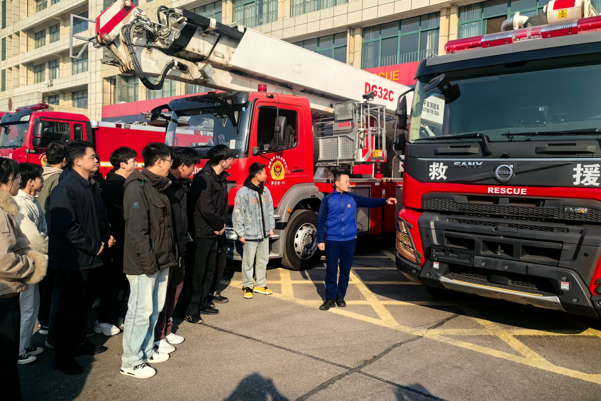 本次活动以沉浸式体验为主线,内容充实,环节紧凑。在消防救援人员的引导下,同学们系统参观了各类先进的消防装备,认真聆听消防员对不同装备的功能特性、操作规范及实战应用的专业细致讲解。在随后进行的互动环节中,同学们在消防员专业指导下亲身体验了消防救援服的穿戴,并深入了解了各类消防车辆及灭火机器人的差异化功能与作战场景。活动尾声,同学们观看了40米高喷消防车的高空灭火操作演示,观摩了部分日常训练项目,见证了消防员们一分钟内出警的全过程。
