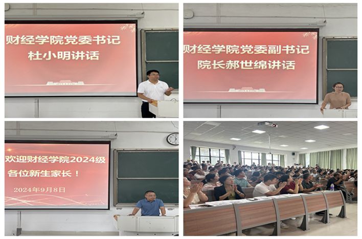 为强化家校联系,凝聚育人共识,9月8日下午,财经学院在致知楼C111召开2024级新生家长见面会。学院党委书记杜小明、院长郝世绵出席会议。新生辅导员及200余名新生家长参加见面会。学院党委副书记、纪委书记耿广汉主持会议。