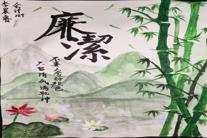 学院征集到多幅原创作品,经过投票评选,最终选出张益菲同学的《爱“廉”说》、林美霞同学的《心至廉,路致远》、李晨睿同学的《行如青竹心同莲》、李若琪同学的《廉政清明,铁“拳”无私》作为此次征集活动的优秀作品。通过此次主题画作征集活动,加深学习了习近平新时代中国特色社会主义思想、习近平法治思想和党风廉政建设的重要论述,突出学习宣传了宪法,加强民法典宣传,新颁布的法律法规宣传,学习宣传了党内重要法规。