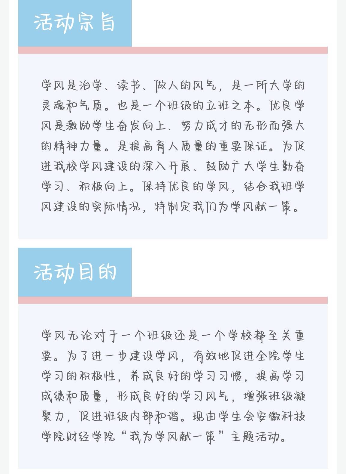为了进一步加强学风建设的深入开展,结合安徽省全民终身学习活动周,有效地促进同学们学习的积极性,形成良好的学习风气。财经学院学生会于12月7日至12月18日联合易班在线上举办“我为学风献一策”主题活动。