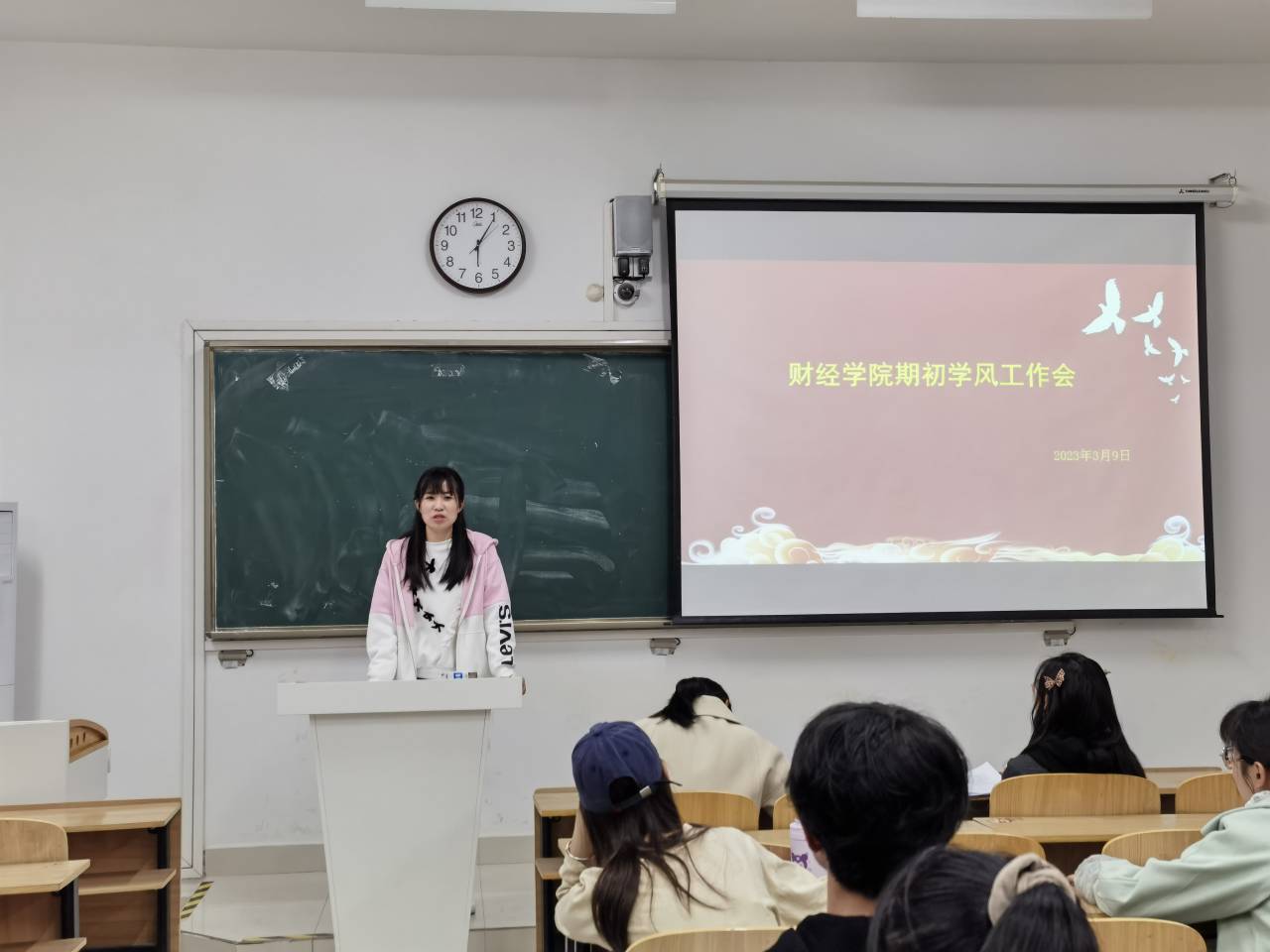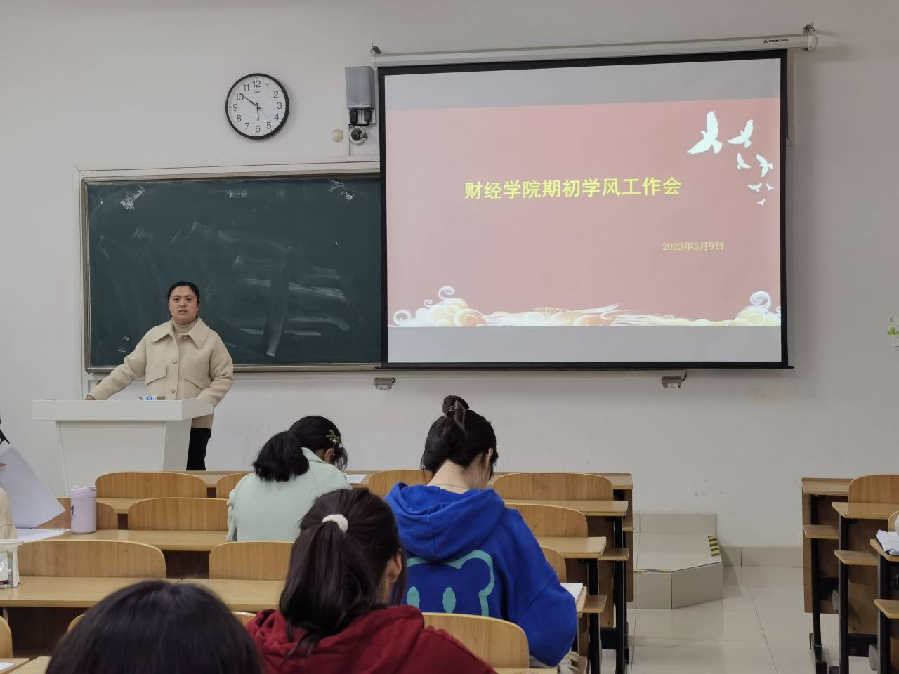 宣晶晶对本学期学风建设相关工作作了部署,重点就日常考勤、课堂学风督查、晚自习督查等工作做了部署。要求学习委员做好班级同学与学院、教师之间沟通的桥梁,进一步严肃课堂考勤,与学院和任课教师形成工作合力,共同营造优良学风。