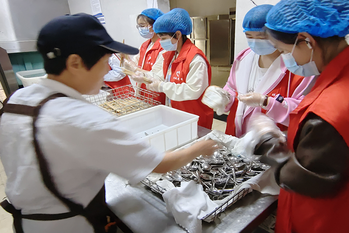活动中,同学们在工作人员的指导下消毒换装,参观了后厨的消毒区和工作区,并与工作人员一起搬运物品、清洗蔬菜、烹饪加工、成品装盘、窗口售餐、回收餐具、餐桌清理……在工作人员的耐心指导下,同学们与工作人员一起忙碌起来,井然有序,干劲十足,参与和见证了一份份热气腾腾的美食是如何一步步传递到学生手中。
