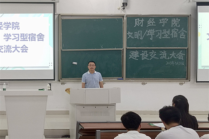 为深入学习贯彻习近平新时代中国特色社会主义思想,树立学生学习生活榜样,倡导文明言行爱校如家,切实加强学生公寓安全管理,营造文明、和谐、安全、舒适的学习生活环境,财经学院于5月31日下午在致知楼B111教室召开文明宿舍、学习型宿舍创建交流大会。学院党委副书记、纪委书记耿广汉出席会议。会议由辅导员丁雨妍主持。学院各班级寝室长参加了会议。