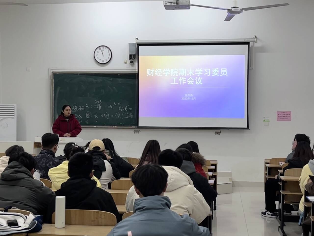 宣晶晶充分肯定本学期班级学习委员在学院学风建设工作中发挥的重要作用,向学习委员的辛勤付出表示感谢,希望大家一要进一步明确工作职责,发挥模范作用,严格课堂考勤,督促前排入座率、抬头率等,将学风建设工作常抓不懈;二要重视诚信考试,抓好期末复习,端正应考态度,规范考试行为,坚定诚信信念。宣晶晶领学学生诚信考试相关文件,详细要求了考试座位安排,希望全体财经学子考出水平,展现风采。