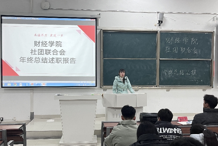 为进一步加强和规范学生社团的建设与管理,充分发挥学生社团育人阵地作用,提高学生干部履职能力,12月27日,财经学院在龙湖校区致知楼A111召开2023-2024学年第一学期期末学生社团述职评议考核会。学院团委书记薛枫,辅导员、社团指导老师丁雨妍、陆文斌,学生社团主要负责人及学生代表参加会议。