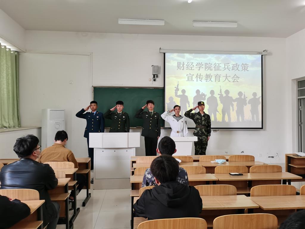 为进一步做好大学生应征入伍工作,4月5日上午,财经学院举办征兵宣传教育大会。保卫处闻兵老师,校八一社成员冯乐、查志强等四位优秀退役大学生应邀宣讲。学院辅导员宣晶晶、王天云以及学院2019级有当兵意向的男生参加了宣讲会。会议由学院党委副书记、纪委书记耿广汉主持。