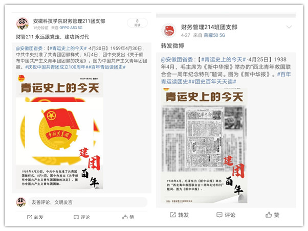 活动中,各团支部在微博上积极参与安徽团省委微博推出的“青运史上的今天”“团务知识百问百答”“我与团旗合影”话题联动;通过拍摄微视频的形式踊跃参与团中央开设“永远跟党走 建功新时代”网络话题接力活动。
