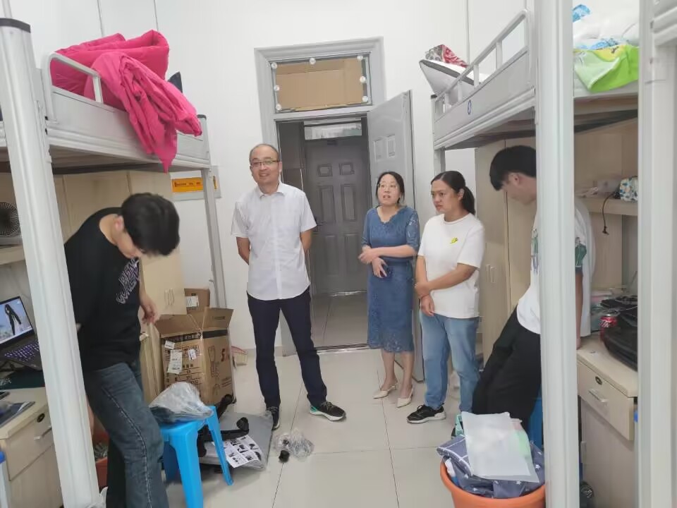 在新生宿舍,学院领导对同学们的到来表示热烈欢迎,并与他们亲切交谈,零距离了解他们进校后的适应情况、衣食住行情况;提醒新生切实做好常态化疫情防控工作,提高安全防范意识,注意人身、财物和信息安全;鼓励同学们调整状态,合理规划大学生活,提高自律与独立生活能力,互助友爱,勤奋学习,志存高远,积极融入到班集体,尽快融入到大学的学习生活中。