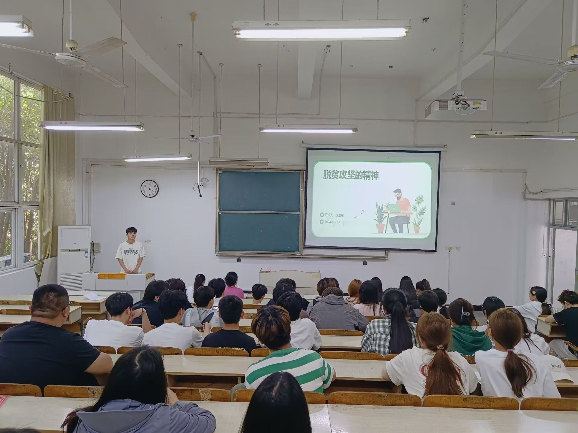 围绕脱贫攻坚精神,徐浩东从脱贫攻坚背景、脱贫攻坚精神内涵解读、大学生如何践行脱贫攻坚精神、校园内外扶贫活动案例分享以及总结反思与心得体会进行讲解。他强调,大学生应当树立正确价值观导向,把脱贫攻坚作为服务人民、奉献社会的重要实践,积极参加社会实践活动,结合所学专业知识帮助当地人民,关注弱势群体,传递正能量。此外,他还分享了一些校园内外扶贫活动案例和个人成长收获,呼吁同学们将所学应用于实际生活中。他还鼓励学生会成员要学习基层工作者无私奉献、一心为民的精神,将为同学服务内化于心,外化于行,真正做到为同学办实事。