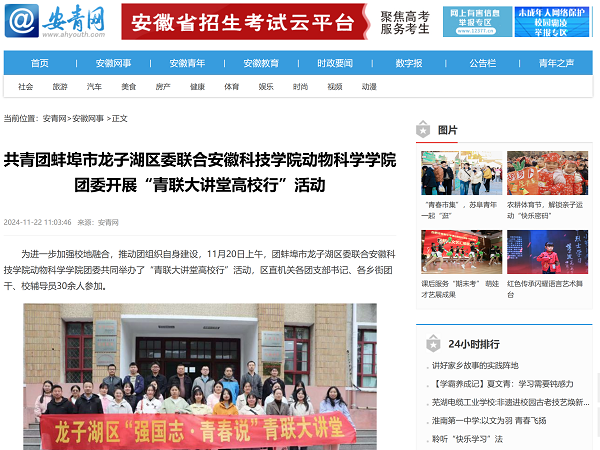 2024年,安徽科技学院动物科学学院团委在学院党委和学校团委的正确领导下,深入学习贯彻习近平新时代中国特色社会主义思想和党的二十大、二十届三中全会精神,紧扣立德树人根本任务,坚持“服务青年成长成才、助力学院跨越发展”的工作主线,砥砺前行、创新求变。各项工作得到了安徽共青团网站、蚌埠市人民政府网站、安徽青年报、安青网等多家媒体的集中报道与关注。学院团委紧紧围绕立德树人根本任务,不断创新工作思路,在思想引领、实践育人、创新创业及志愿服务等方面多点发力,取得了丰硕成果。