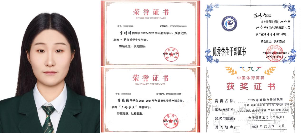 李晴晴,中共党员,2021级动物医学专业本科生,曾担任班级团支书,曾获校优秀学生干部、学业一等奖学金、三好学生、2023年蚌埠市排球联赛女子组团体第三名等荣誉。目前以优异成绩拟录取为中国农业科学院兰州畜牧与兽药研究所基础兽医学专业研究生。