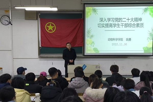 为深入学习贯彻党的二十大精神和习近平总书记中国足彩网青年工作的重要论述,引导广大学生骨干增强政治素质、坚定理想信念、提高政策理论水平、优化能力结构,11月30日下午,动物科学学院2022-2023学年团校暨学生干部培训班隆重开班,动物科学学院党委书记姚勇应邀给培训班学员授课,来自学院74名学生干部参加培训。