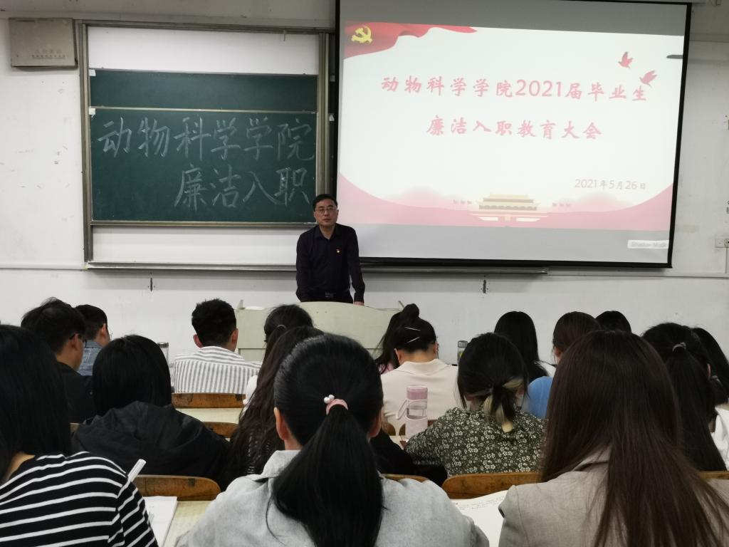 为加强毕业生党员的党性修养,增强毕业生党员的廉洁自律意识, 5月26号上午,动物科学学院在求知楼A102召开2021届毕业生党员廉洁入职教育大会。动物科学学院党委书记姚勇,党委副书记汤帅,团委书记李焱,辅导员胡文丽及2021届全体毕业生党员参加会议,会议由汤帅主持。