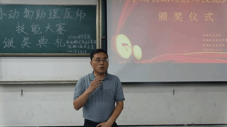 颁奖环节结束后,阮崇美老师上台发言,他对小动物助理医师技能大赛的成功举办表示祝贺。他表示,现代社会需要的不仅仅是学历,更重要的是能力,专业技能竞赛可以让学生更好地把理论应用于实际。