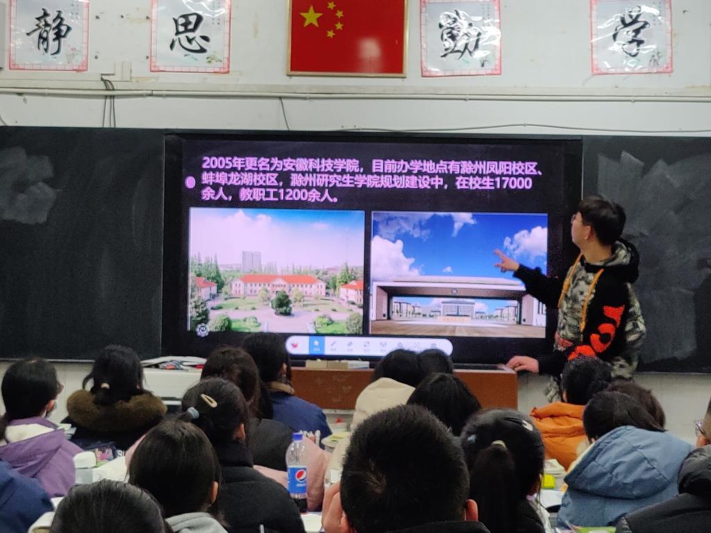 动植物检疫212班赵长旭及其团队三人组成的实践团队赴安徽机电工程学校开展了寒假实践活动。实践团探望了高中班主任与任课老师,向老师讲述了自己在大学的变化与成长,由衷感谢老师们的教诲之恩。随后实践团队来到了高三毕业班,向同学们播放了安徽科技学院招生宣传片,向学弟学妹们传授了各自的学习经验,并且耐心回答同学们在专业选择、报考和学习上的问题。