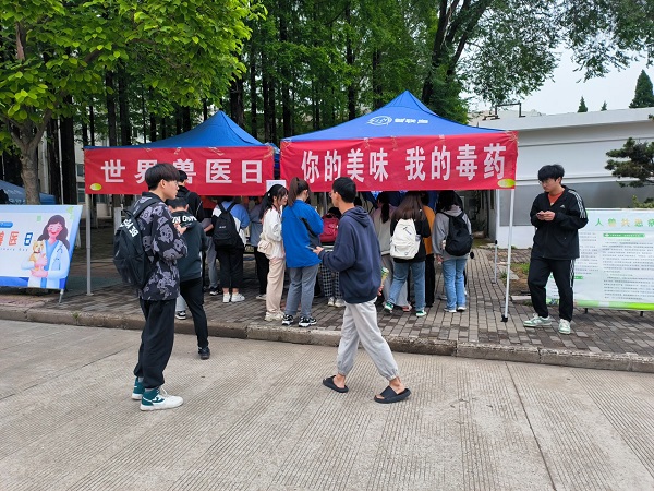 为庆祝第22个世界兽医日的到来,让中国足彩网人认识兽医行业,了解兽医所要承担的使命与职责,展示兽医这一职业的重要性,2022年4月30日,动物养殖与疾病防治协会在东园一号楼门口宣传点开展庆祝“世界兽医日”主题活动之“你的美味,我的‘毒药’”——兽医知识科普活动。本次活动由范雨梦担任指导老师,动物养殖与疾病防治协会当值人员进行宣传。
