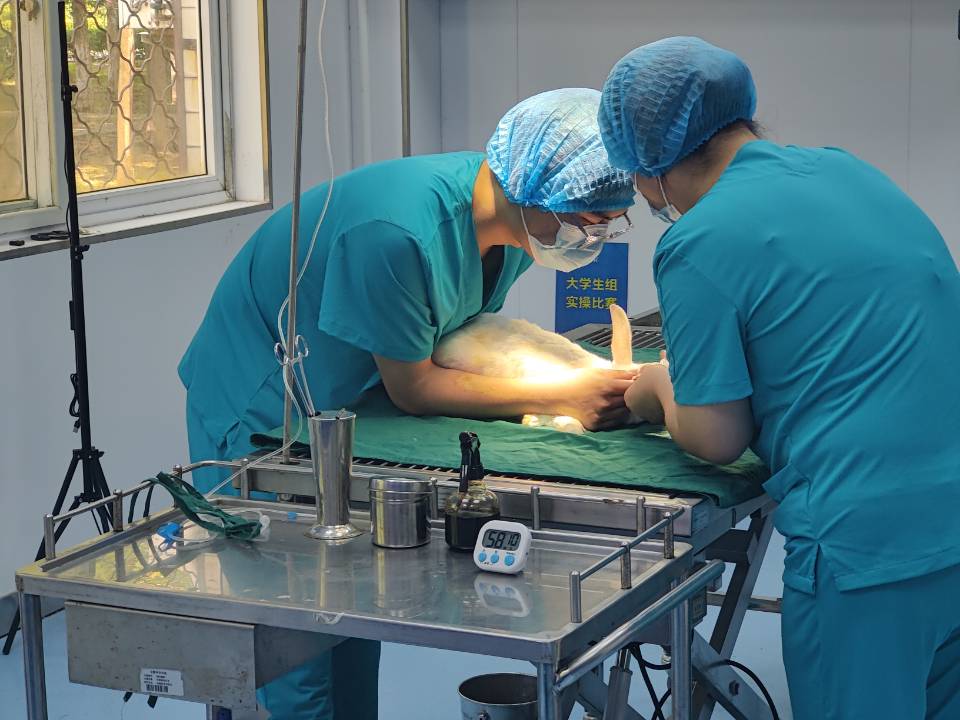 5月26日,第七届“雄鹰杯”小动物医师技能大赛在安徽科技学院附属兽医院手术室完成理论和实验操作考核,其中理论考核采用线上专业考核系统,随机抽取试卷进行作答;实验操作考核包括兔胃切开术、血涂片制作和徒手打结。