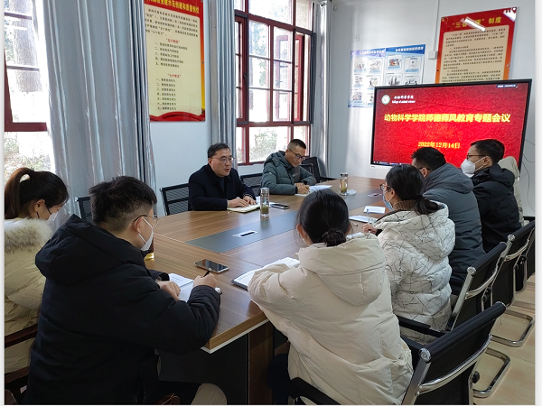 为全面学习贯彻落实党的二十大精神,进一步强化学院师德师风建设工作,12月14日上午,动物科学学院在学院会议室组织新进教师开展师德师风专题教育。学院党委书记姚勇,党委副书记、纪委书记汤帅出席会议,新进教师参加会议。会议由姚勇主持。