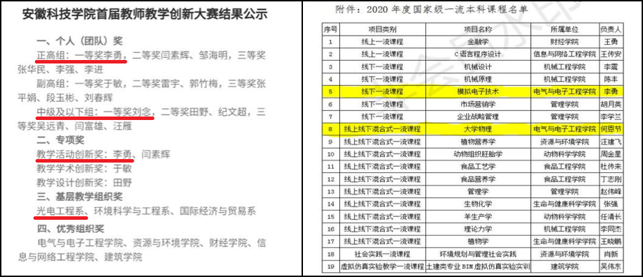 一直以来,光电工程系教工党支部注重加强支部建设,经过支部党员和教师的共同努力,在一流专业建设、一流课程申报、教师教学创新大赛、科研成果、教书育人等方面取得显著成效。光电工程系教工样板支部建设成果颇丰,光电信息科学与工程专业成功获批为省级一流建设专业,《模拟电子技术》与《大学物理》课程被推荐为国家一流建设课程,刘念获得学校首届教师课程思政教学大赛一等奖,李勇、刘念分别获得首届安徽科技学院高校教师教学创新大赛正高组一等奖、讲师组一等奖,刘念获得首届安徽省高校教师教学创新大赛现场赛入围资格,党支部基本上每位党员教师均有在研高质量科研教研项目,左绪忠获批的国家自然科学基金项目现已结题验收,实现了电气与电子工程学院国家自然科学基金零的突破,教师发表高质量SCI学术论文一区2篇、二区4篇、三区3篇、四区2篇,教师指导学生参加国家级大学生物理实验大赛获奖4项,学生考研率逐年递增,学生学风建设取得成效等。