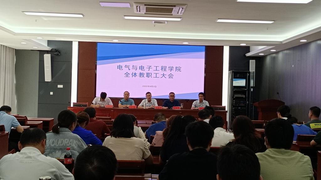 9月2日下午,电气与电子工程学院于西辅楼111报告厅召开新学期全体教职工会议,学院党委书记骆海邦,党委副书记、院长夏显明,党委副书记、纪委书记尚磊,副院长国海,副院长樊晓宇及全体教职工参加了会议,会议由骆海邦主持。