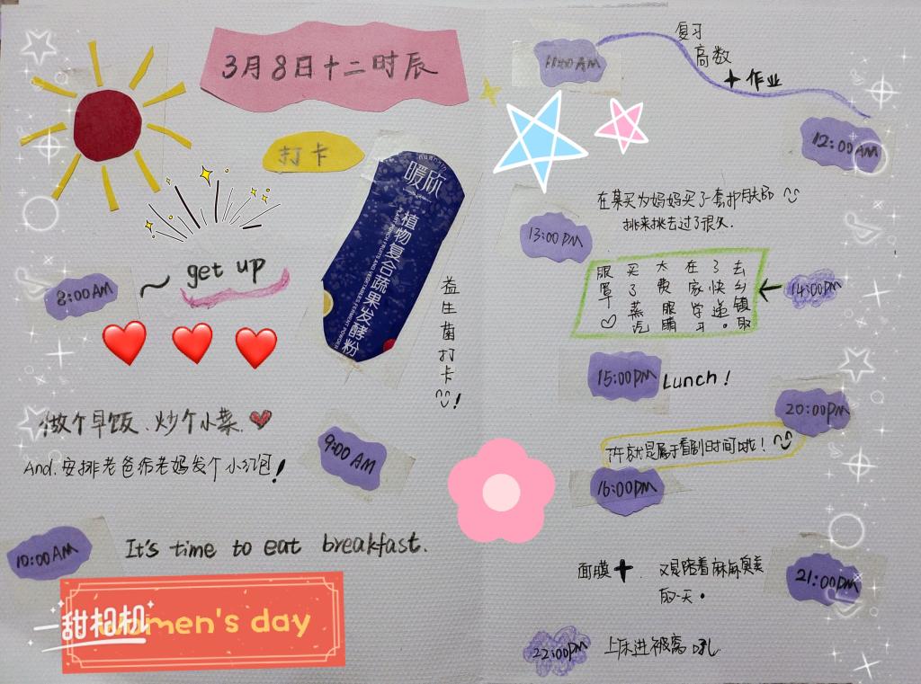 本次女生节的活动包括,第一项,为身边的女性(妈妈、姐姐、妹妹等)做一道菜或手工制作等,这项活动使在家的女大学生在疫情的特殊时期给家人送去了温暖,使得每一个小家庭变得更加温馨,更加充满爱。活动第二项,拍摄“疫情当下,舍小家为大家”的视频,这个活动要求学院学子介绍疫情中一线女性工作者的英雄事迹,介绍她们的故事等。拍摄的故事视频中有“试疫苗第一针”的陈薇院士、有“年过古稀仍奋战一线”的李兰娟院士、有“如今的我,曾经的你”的孙颖、有“舍小家,为大家”的李静……还有太多太多值得我们尊敬的英雄们。